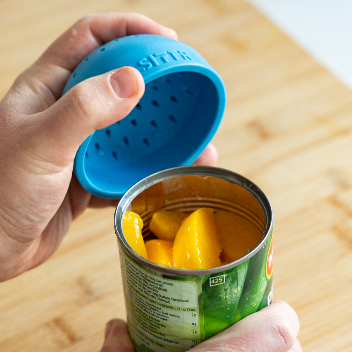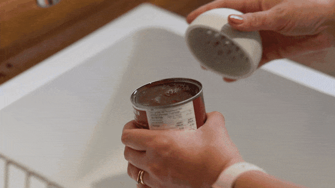 Just press SIFTR onto the top of an open can, flip it over the sink, and let it drain. The food stays inside — no splashes, no wasted water, and no need to rinse a colander after. Give the can a quick shake to clear any residue, then lift and serve.